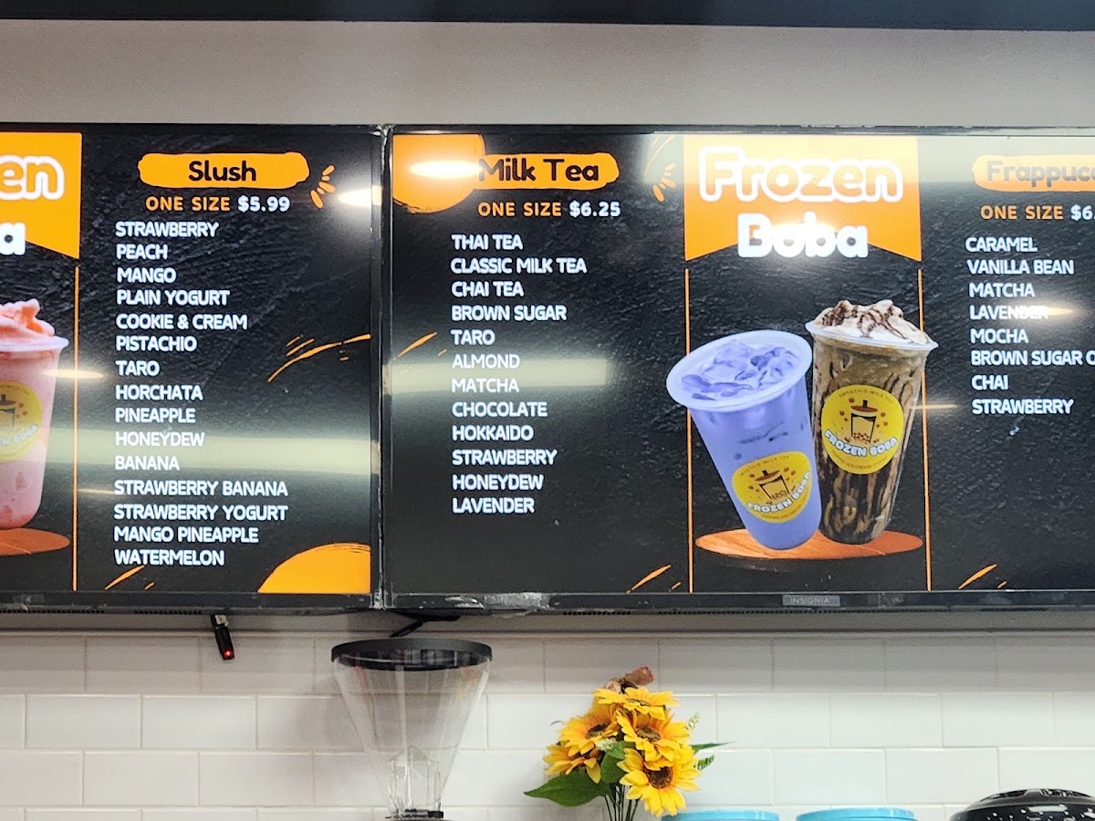 The menu at Frozen Boba features a variety of beverage options centered around milk teas, smoothies, and slushes. Each category offers a selection of flavors catering to different preferences, suitable for casual refreshments or light breaks throughout the day.
